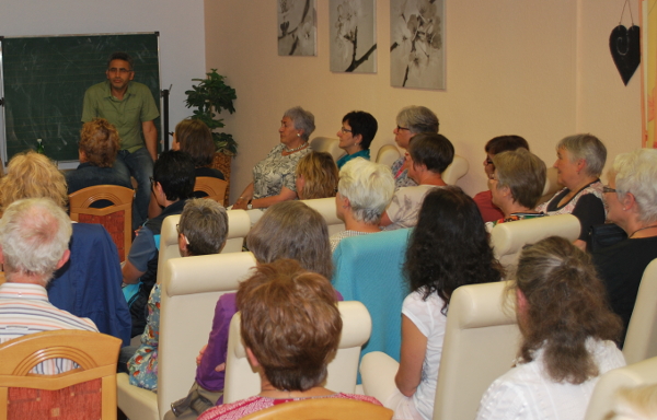 Die anschließende angeregte Diskussion drehte sich u.a. um die Fragen der Achtsamkeit. Welche Möglichkeiten gibt es um Achtsamkeit zu üben? Hassan El Khomri erläuterte das am Beispiel einer schönen Blume die wir sehen, die uns kurz anregt und dann aber die Gedanken abschweifen lässt (z.B. an andere Ort mit Blumen usw.). Um die Achtsamkeit zu üben sollte man sich auf die konkrete Blume fokussieren und deren Schönheit unbeinflusst von anderen Gedanken aufnehmen. Also inne halten und erleben.