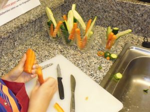 Leckere Rohkoststäbchen mit Kräuterdip entstanden und der Belag für die Pizza musste zurechtgeschnitten werden.