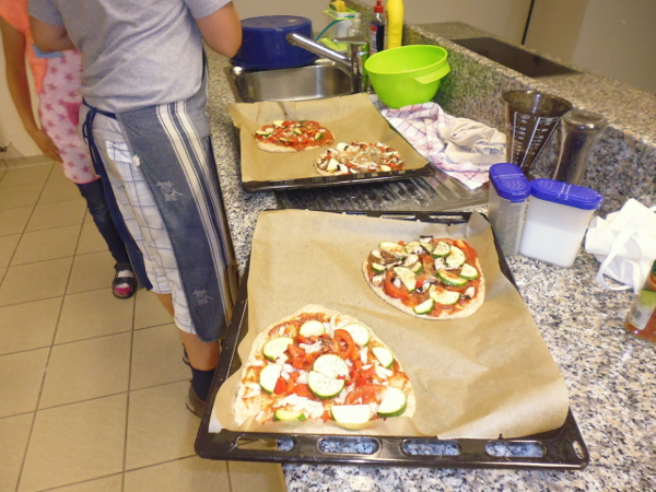 Eine eigene Tomatensoße wurde ebenfalls hergestellt und kräftig gewürzt. Jedes Kind konnte dann seine Pizza nach Wunsch mit Champignons, Zucchini, Paprika und Zwiebeln belegen und die Pizzen würzen.
