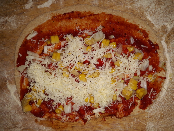 Zwiebeln, Paprika, Mais und weitere Zutaten nach Wunsch, für den Belag sehr klein schneiden.