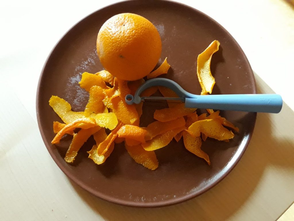 Sich den eigenen Vorrat anzulegen geht ganz einfach. Dazu nimmt man Bio-Orangen deren Schale zum Verzehr geeignet ist, wäscht diese mit heißem Wasser, trocknet sie ab und schält nur die orange Haut mit einem Sparschäler hauchdünn ab. Diese Schalen werden auf einem Küchentuch ausgebreitet und bei Zimmertemperatur oder auf der Heizung getrocknet. Man kann auch die Nachwärme des Backofens oder soweit vorhanden, einen Trockenofen benutzen.